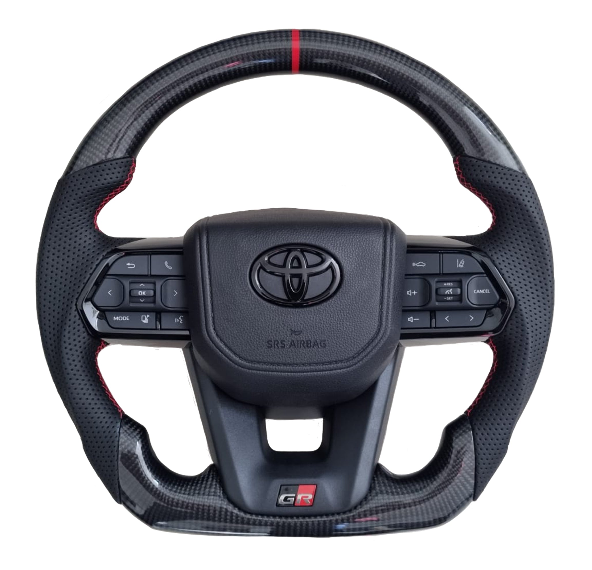 Toyota VX300 GR Steering Wheel - Full carbon top and bottom, black perforated leather sides, red stitching.