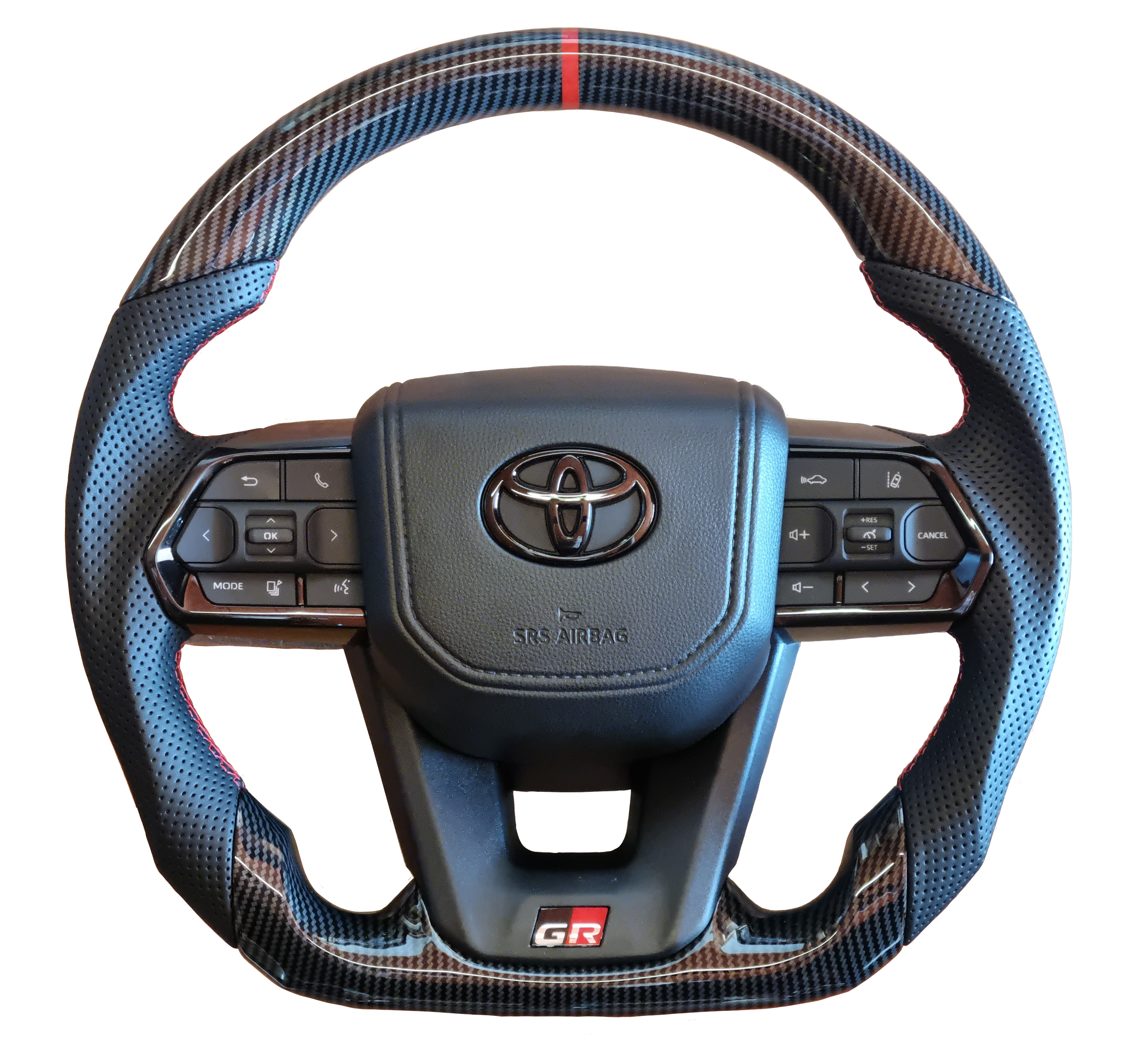 Toyota VX300 Hydro Dipped Carbon Steering Wheel with Black Toyota Badge and GR Badge. Red Stripe and Red Stitching.