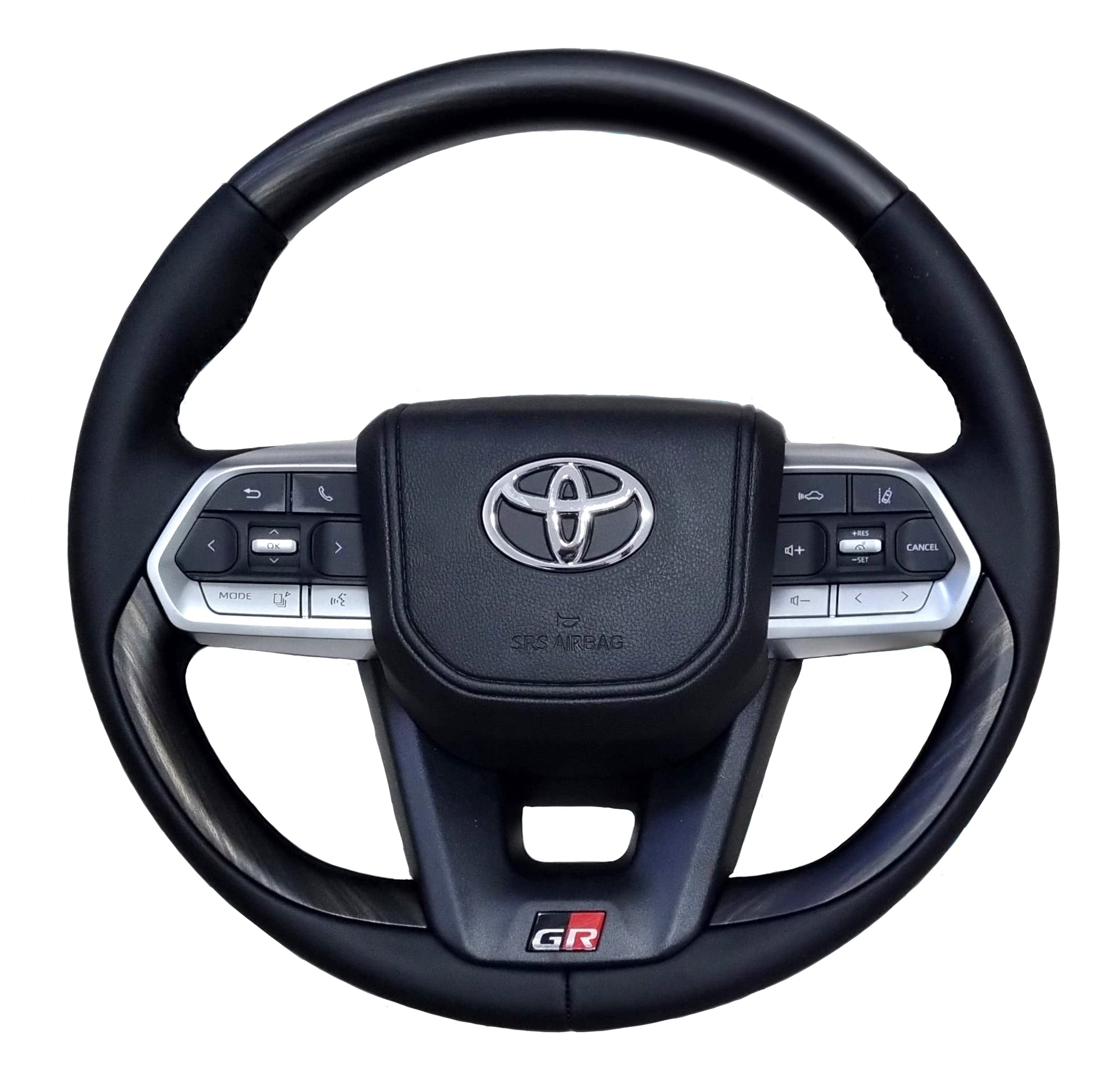 Toyota VX300 GR Steering Wheel wood grain top and bottom, smooth black leather sides and silver trim.